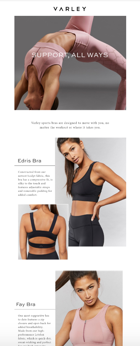 Email Varley MuteSix worked with the high-end performance apparel company to help them scale. The Goal Varley came to MuteSix looking to scale. They were using Mailchimp for email and sending out weekly newsletters but had no automation setup. The Strategy The team moved Varley to Klaviyo once they launched their new site with Shopify and implemented JustUno for email collection. We set up a Welcome Series, Abandoned Cart Series, Browse Abandon Series, Customer Thank You, as well as custom flows for Holidays and Promotions. 2,442% Email revenue growth in 7 months 427% List growth in 7 months 100% List growth in 30 days Back View Next Case Study