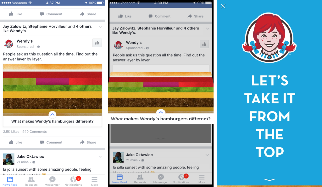 Here’s a Facebook Canvas from Wendy’s, their canvas tells a story (which is interactive) and allows the user to interact with various parts of the canvas: