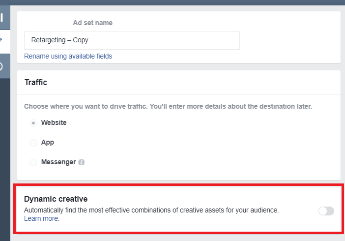 Dynamic Creative is a new feature found at the ad-set level that allows you to submit up to 30 creative assets which Facebook then mixes to see which combination provides the best results.