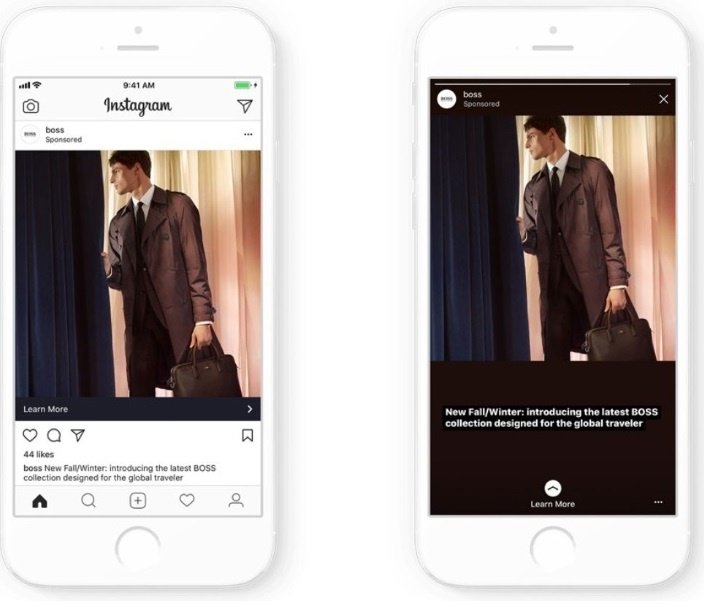 Let’s say you’re running a product ad that you would like to show on the Instagram news feed and Stories placement. You’d create your advert using either an image or video (15 seconds or less) and craft a text headline, and then Instagram would automatically resize your content to fit within Stories, like so: